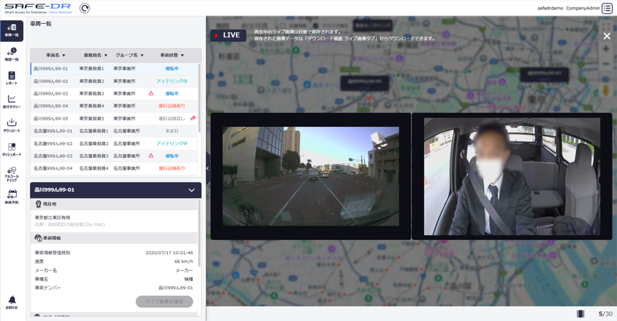 管理者側モニターの地図上に車両の位置や状態を表示。エンジンがかかった状態の車両からは、ライブ機能として今撮っている画像を取得することが可能です。
